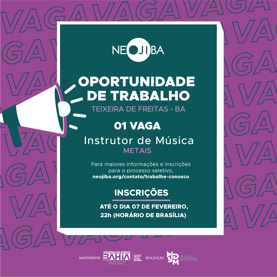 O Instituto de Desenvolvimento Social pela Música (IDSM), Organização Social que faz a gestão do PROGRAMA NEOJIBA (Núcleos Estaduais Juvenis e Infantis da Bahia), no uso de suas atribuições legais, torna pública a realização do Processo Seletivo Simplificado para contratação de pessoal, em regime CLT, para o cargo de INSTRUTOR DE MÚSICA PARA METAIS.