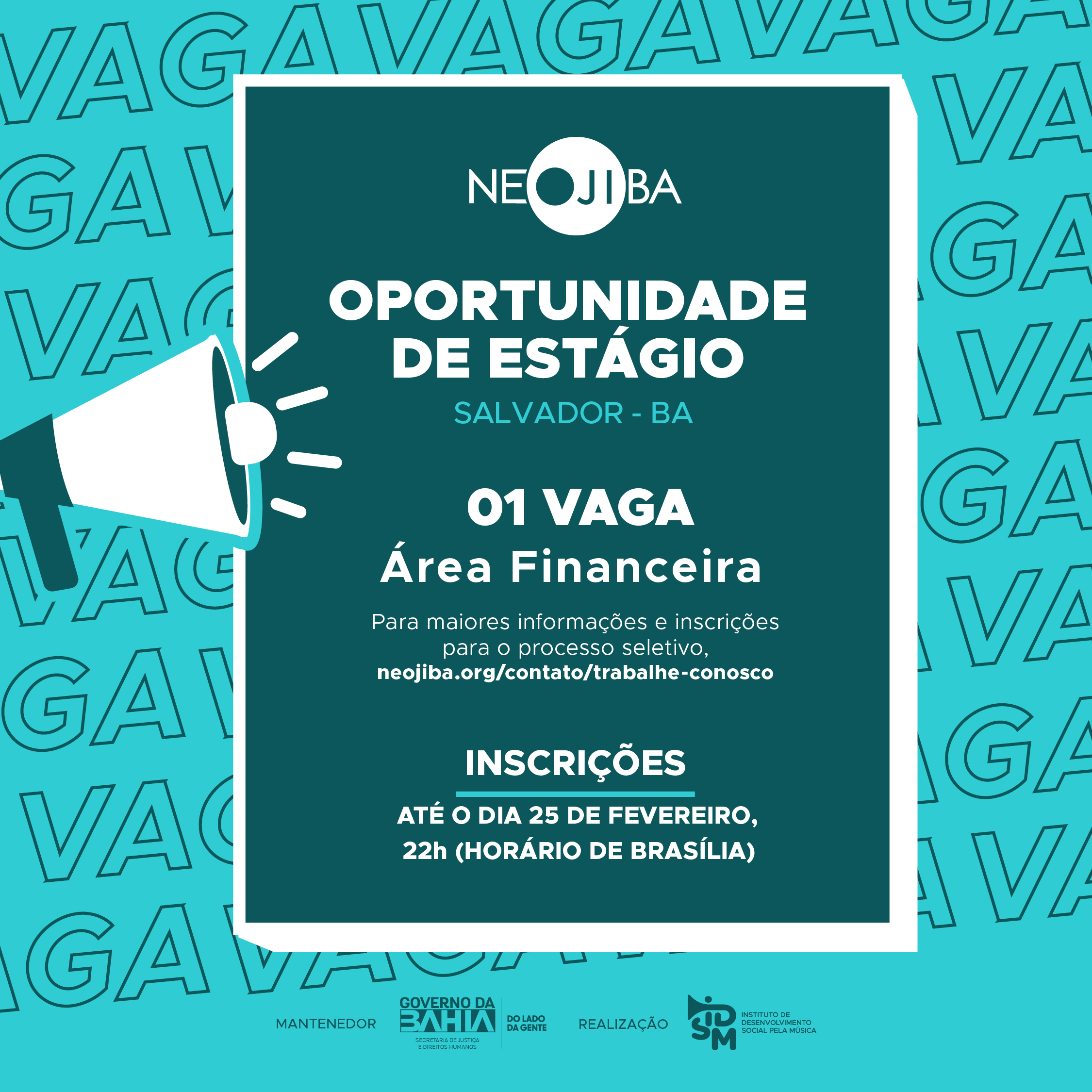 1 vaga para estágio no setor Financeiro do NEOJIBA, executando atividades administrativas e financeiras.