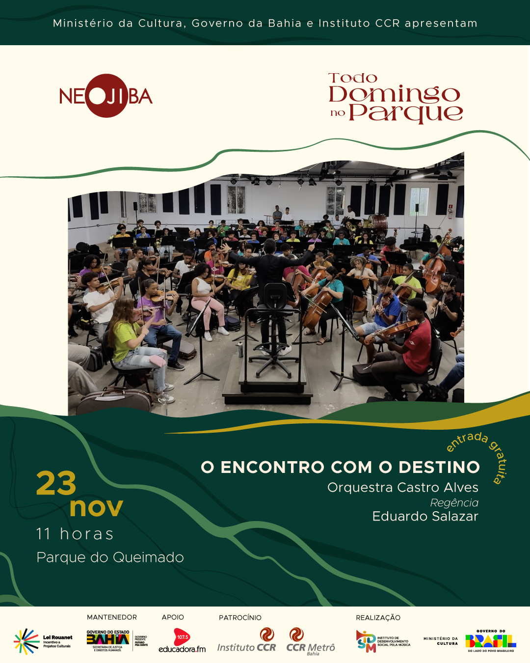 O Todo Domingo no Parque conta com patrocínio do Instituto CCR, na área de atuação da CCR Metrô Bahia (@ccrmetrobahiaoficial), via Lei de Incentivo à Cultura
