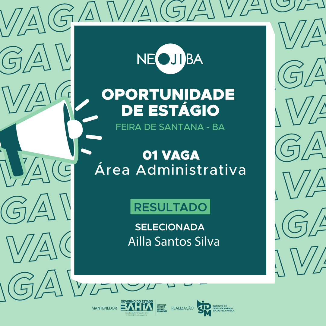 O Instituto de Desenvolvimento Social pela Música (IDSM), Organização Social que faz a gestão do PROGRAMA NEOJIBA (Núcleos Estaduais Juvenis e Infantis da Bahia), no uso de suas atribuições legais, torna pública a realização do Processo Seletivo Simplificado para contratação de 01 estagiário para atuar no setor Pedagógico do programa, no núcleo Territorial do NEOJIBA em Feira de Santana.