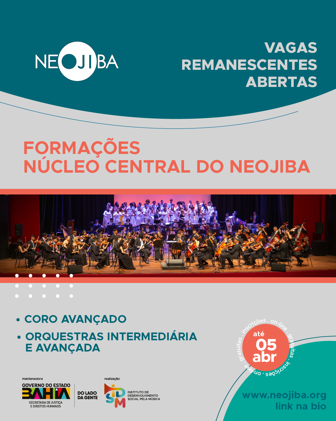 Estão abertas as vagas remanescentes das orquestras avançada e intermediária do NEOJIBA e do coro avançado do NEOJIBA. Leia atentamente o regulamento e faça sua inscrição até 05 de abril de 2026 (Link de inscrição dentro do regulamento). As peças para estudo e regulamento estão abaixo.